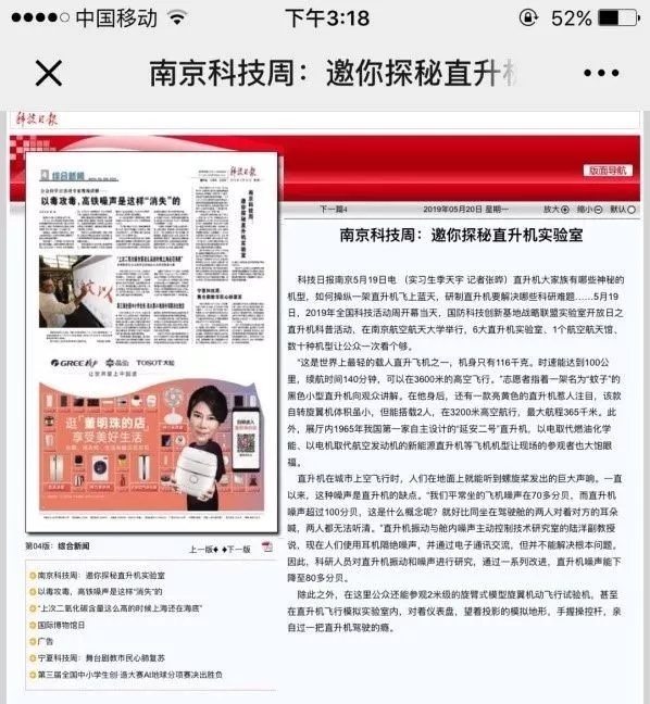 位于南航校园内的南京航空航天馆是现场最热闹的展馆,各类飞行器的展示吸引了大批观众,更有附近中小学组织的统一参观。讲解员为参观者一一讲解了各个飞行器的研究历程、性能及特点等,并对参观者的提问进行了详细解答。在操纵演示教学实验室,直升机系系主任高亚东为参观者生动而形象地介绍了旋翼机和直升机的区别。不少参观者对这次实验室开放活动表示赞赏与支持:从事雷达制造与研究的李女士表示:“这次活动让孩子对旋翼等直升机部件有了直观性的认识,帮助孩子了解到父母从事的工作究竟是什么样子的。”另一位家长表示:“这个活动一方面展示了南航在科研方面卓越研究能力,同时也更好的服务了社会,进行科普教育,展示了国家级重点实验室的风采。”