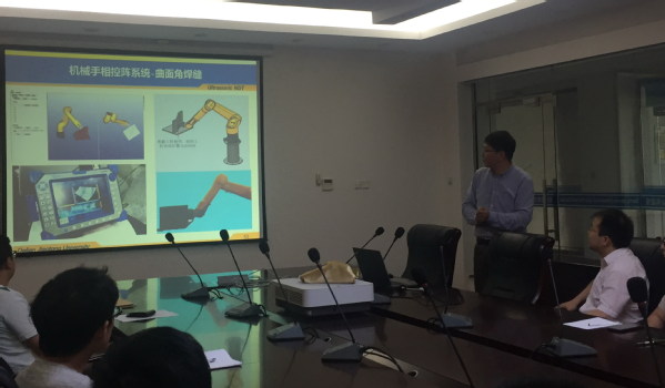 报告主要介绍了超声无损检测建模方法和自动化检测技术两部分内容。首先,报告介绍了目前超声仿真建模方法的理论研究进展。之后介绍了高频超声和超声相控阵两种检测技术和成像检测方法,包括全聚焦成像方法、三维数据体绘制成像技术,最后介绍了自动化超声检测系统,及其在焊接结构、电子封装、复杂型廓构件检测领域的应用。报告内容丰富、精彩生动,报告会由吴大伟教授主持。会后,赵新玉副教授与公司师生做了深入的交流和探讨及补充和解答。