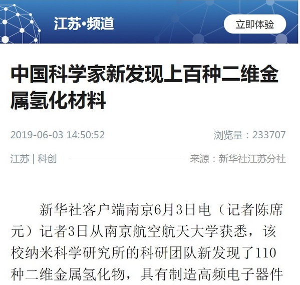 新华社客户端南京6月3日电(记者陈席元)记者3日从bevictor伟德获悉,该校纳米科学研究所的科研团队新发现了110种二维金属氢化物,具有制造高频电子器件的应用潜力。相关成果近日发表在国际材料化学领域期刊《美国化学学会会刊(JACS)》上。