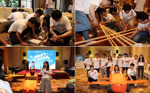 经过讲座互动交流学习,员工们期待的“飞上云霄”环节让他们体验了制作航模的乐趣,经过熟悉规则,分组讨论制定方案,然后分工协作,齐心协力,经过争分夺秒的紧张赶制,终于在规定的70分钟内完成了航模制作。最终经过制作速度、新闻发布会演讲、载人滑行、团队才艺表演等综合评判,橙色战队一举夺魁,将会场氛围推向高潮。