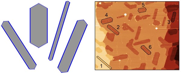晶体一般会以自己喜欢的形状存在于自然界。例如,晶莹透亮的钻石具有正八面体的形状,而日常用的食盐则具有六方柱体的形状。认识晶体的形状不仅可以获得晶体内部的原子排布、形成过程等很多有价值的信息,而且对工业加工、商业应用等起到重要的指导作用。一般来讲,晶体的形状是由其能量较低的晶面决定;这些晶面根据晶体的对称性沿不同方向切成特定的形状,使得晶体的总表面能达到最小。随着近来二维原子晶体研究的兴起,这类原子级厚的晶体的形状受到了学术界的广泛关注。不同于传统的三维晶体,二维原子晶体的表面降维成了边缘,其相应的形状变成了各种各样的多边形。比如,石墨烯的形状一般为六边形,而六方氮化硼单层(俗称白石墨烯)的形状多见为三角形。