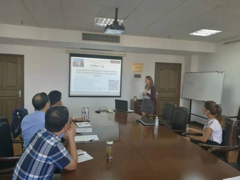 Dalma Nagy作了题为“Experimental estimation of tactile reaction delay during stick balancing using cepstral analysis”的学术报告。报告中介绍了触觉反应时滞的实验设计和计算方法,重点介绍了利用倒谱(反谱)分析方法估计加速度信号中的时滞。