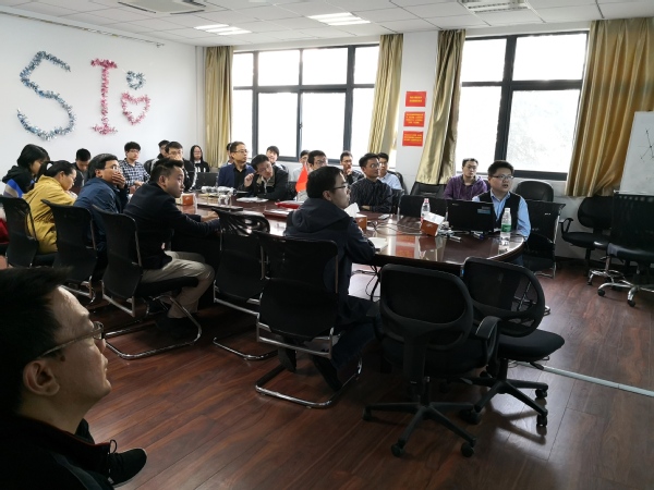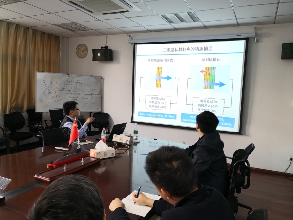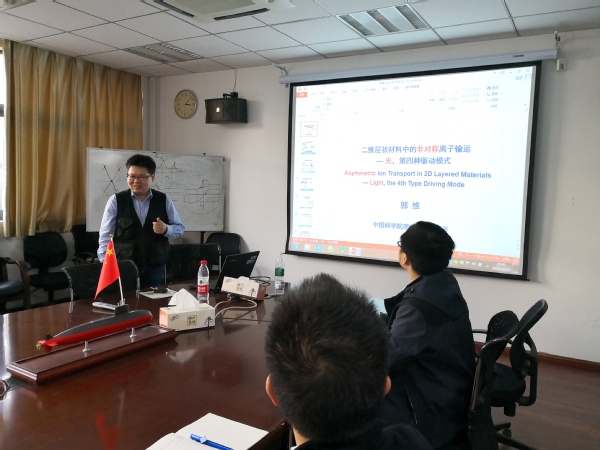 郭维研究员介绍了非对称输运的常用驱动方式,报告了其课题组近年来在光驱动非对称离子输运体系的大量工作。报告内容不但具有学术深度和高度,还十分详实、生动,对公司相关科研工作具有重要借鉴意义。同时,郭维研究员还结合自己多年的研究经历,与现场听众分享了他在仿生功能材料、界面物理化学、纳米流体、新型能源材料、二维材料等多学科领域的研究心得和体会。报告会由仇虎副研究员主持。会后,郭维研究员与公司师生做了深入的交流和探讨及补充和解答。