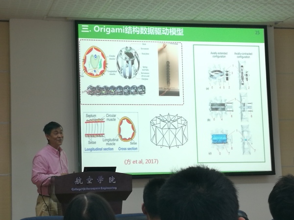 徐鉴教授的报告从数字化和数据驱动两个方面,针对蠕动波、折纸结构和并联机械臂的高精度控制,建立了蠕虫型机器人平面运动数字化模型、折纸结构的简化等效模型和数据驱动下的智能控制模型,并对多物理场引起的多传感器信息融合、数据驱动的动力学建模、复杂环境下基于动力学模型的学习控制等方面进行了展望。报告内容十分详实、生动,有趣,引起了公司师生的广泛兴趣和讨论。同时,徐鉴教授还结合自己多年的研究经历,与现场听众分享了他在非线性动力学、仿生结构与机器人等方面的研究心得和体会。报告会由高存法教授主持。