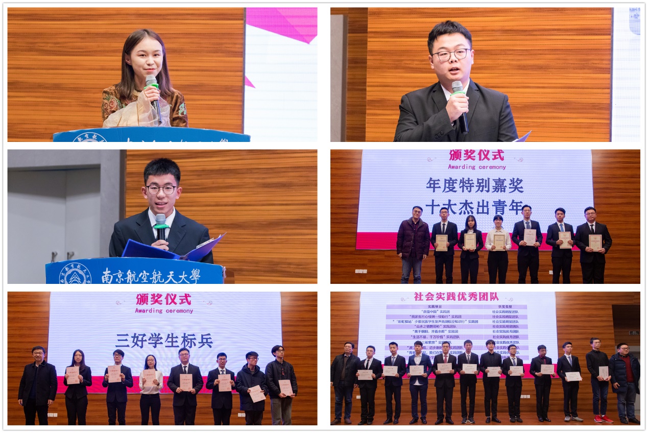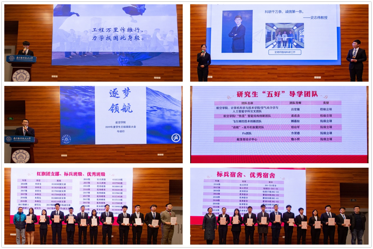 航空青年要求真,修身立德,明辨是非,匠心逐梦;要励志,学深悟透,真信笃行,扬帆领航。国家奖学金获得者、2017级研究生戴雨可分享了自己的科研求真之路,年度特别嘉奖之笃学奖获得者聂连瑞则介绍了自己小女子、大担当的成长轨迹。7名同学代表他们的团队展示了一年来参与第十五届国际老员工工程力学竞赛、SAE国际航空设计大赛、2018中国国际飞行器设计挑战赛、周培源力学竞赛、中国老员工物理学术竞赛、研究生未来飞行器大赛等国内外重量级竞赛并获得各类荣誉的事迹,以赛促学、学以致用,航空学子一直在路上。随后,大会颁发了国家奖学金、国家励志奖学金、园丁励志奖学金、少数民族员工学业精进奖学金、特别奖学金。