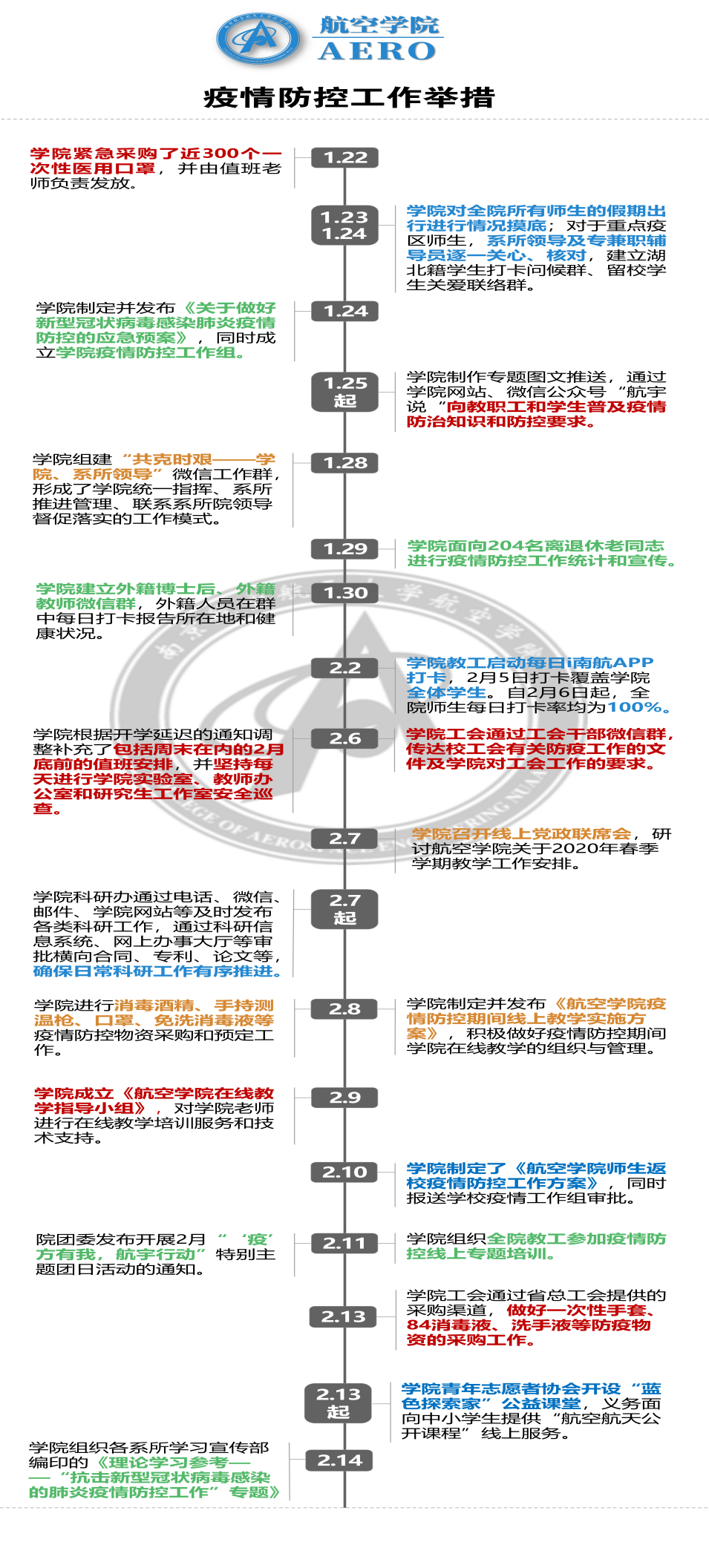 自2020年1月下旬新型冠状病毒疫情爆发以来,航空公司党政领导思想上高度重视,及时贯彻党中央、国务院决策部署和习近平总书记重要指示精神以及公司党委的工作部署;行动上快速应对,采取多项防控措施,带领全院师生共同做好疫情防控工作。