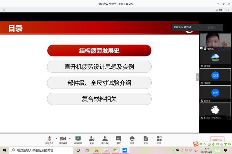 徐海斌高工在报告会上通过举飞机疲劳事故的例子,既让师生们了解了飞机疲劳发展史,也使师生们明白了事故是设计、维护和条例演变的推进剂的道理。徐高工在报告会上也介绍了直升机疲劳设计中的几种思想的发展及其优缺点,并用实例进行了详细说明。然后展示了直升机疲劳设计中部件级、全尺寸试验的照片,师生们对直升机设计中部件的疲劳试验有了更直观的认识。最后,徐高工从复合材料用量、用途和未来发展方面介绍了复合材料在直升机疲劳设计中的相关知识。