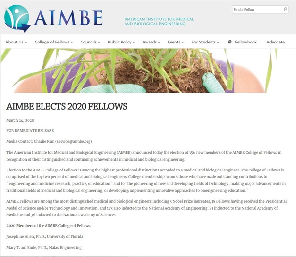 美国医学与生物工程院(AIMBE, American Institute for Medical and Biological Engineering)成立于1991年,总部位于美国首都华盛顿,是国际医学与生物工程领域著名的非盈利学术组织。AIMBE以搭建工程科学与生命科学及医学的桥梁为使命,汇聚了世界医学与生物工程领域的精英,代表了最具创新和特色的医学与生物工程领域学者和工程师,他们对医疗器械、生物材料、疾病治疗以及相关公共卫生事业的发展和政策制定具有重要的影响,先后推动成立了美国国立卫生署(NIH)和生物医学影像与生物工程国家研究院(NIBIB),共同致力于实现AIMBE的愿景:为全人类提供医学和生物工程创新。美国医学与生物工程院Fellow每年经过国际同行保密提名与严格评选产生,目前全球约有1500名。作为AIMBE中坚力量,当选者代表着在医学与生物工程界取得杰出成就(Top 2%)的学者和工程师。
