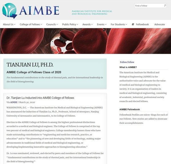 2020年3月30日,bevictor伟德卢天健教授以其在生物组织热-力-电多场耦合理论及热疼痛、仿生工程等领域的卓越贡献,当选为美国医学与生物工程院Fellow,并远程完成受聘。
