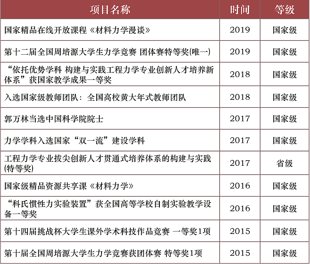(1) 以新工科建设为重要抓手,持续深化专业公司产品改革。强化立德树人根本宗旨,全面落实“员工中心、产出导向、持续改进”的工程教育理念,以新工科建设为重要抓手,深化工程力学“钱伟长班”卓越人才培养模式的研究与实践,持续深化专业公司产品改革。