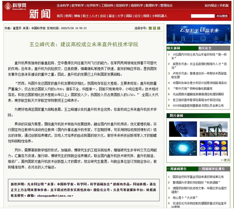 为更好地满足国家重大战略急需,王立峰建议依托直升机专业优势,在高校成立未来直升机技术公司。