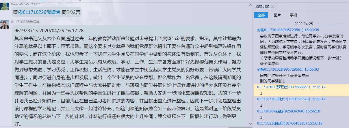 011710603戴颖 :作为员工预备党员,我们更应该担当时代责任,在疫情爆发的时候,我主动在社区担任防疫志愿者,主要负责道路口值守,做好车辆登记,测量过往行人车辆体温的工作。因为疫情的原因,我们不得以在家进行网络课程的学习,有许多同学不太能够适应,因此我们特别成立了党员助学小组,在我所负责的复合材料力学科目,我们初步整理了课程学习期间的习题解析,后续活动将在小组讨论后有序进行。