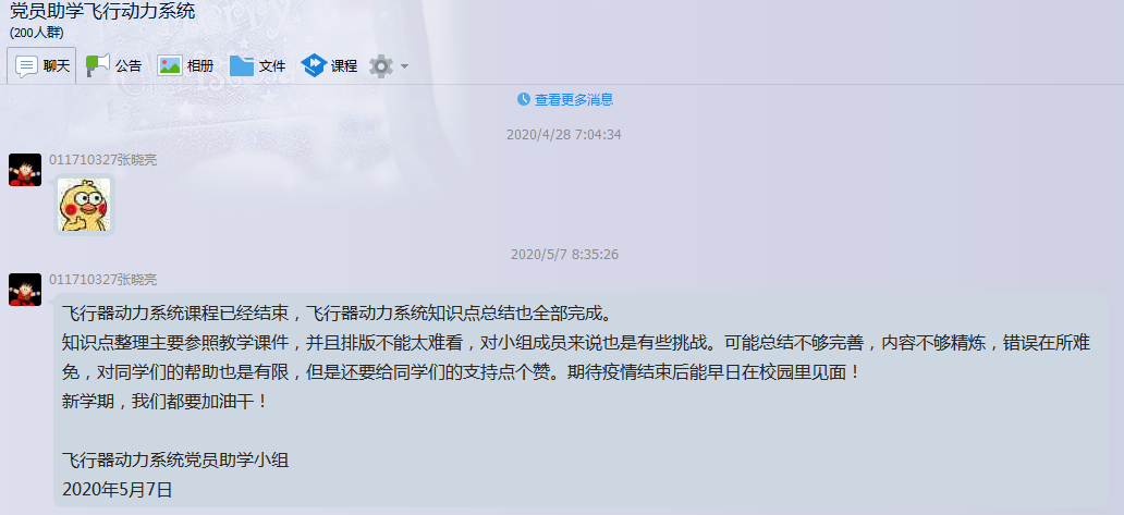 011710327张晓亮:疫情来的很突然,停课不停学来的也是很必然。为帮助同学们线上学习,我们按照科目分成小组,整理资料,总结知识点。如今飞行器动力系统知识点总结的目标也即将实现,可能内容不够精炼,总结不够完善,还要给小组的同学们点个赞。第十周开始,另外几门课陆续开课,我们需要承担更多责任,投入到新的帮扶课程中,不能嫌麻烦或者觉得会影响自己复习就置之不理。无论是复习旧课程还是开始新的帮扶计划,都要务求实效,要为需要帮助的同学考虑。