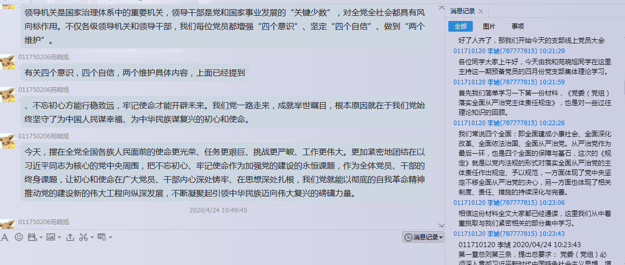 011730102刘畅:作为员工党员,我认为我们的初心便是认真学习知识,以便更好的回报社会,我们的使命便是尽自己所能的回报社会,例如,在学习上帮助其他同学,以身作则,为他人树立良好的榜样。在“不忘初心,牢记使命”主题教育中,我知道了“守初心,担使命”的重要性,虽然是员工,但是我们能做的事情也有很多,在学习上,我们可以为有困难的同学提供帮助,或是督促他们及时复习,完成作业。于是我们成立了助学小组,同学们在遇到难题的时候,可以来问我们,为同学们答疑解惑,交流学习方法。之后我们还会分享学习资料,笔记等复习材料,帮助同学们取得好的成绩。虽然现在是线上授课阶段,但是我们仍然可以通过网络,交流学习方法,帮助困难同学,同时也要让自己不松懈,不怠慢,时时刻刻提醒自己要起到带头作用。“找差距”大会通过批评和自我批评使我认识到了自己的缺点和不足,之后我会更加努力地改正自己的缺点,努力去帮助更多的人,起到更好的模范带头作用。