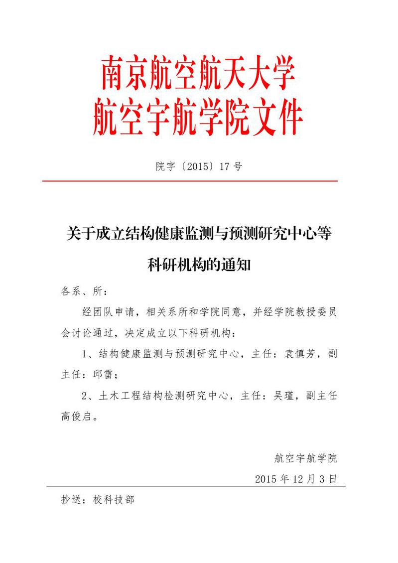 院字[2015]17号关于同意成立结构健康监测与预测研究中心等科研机构的通知