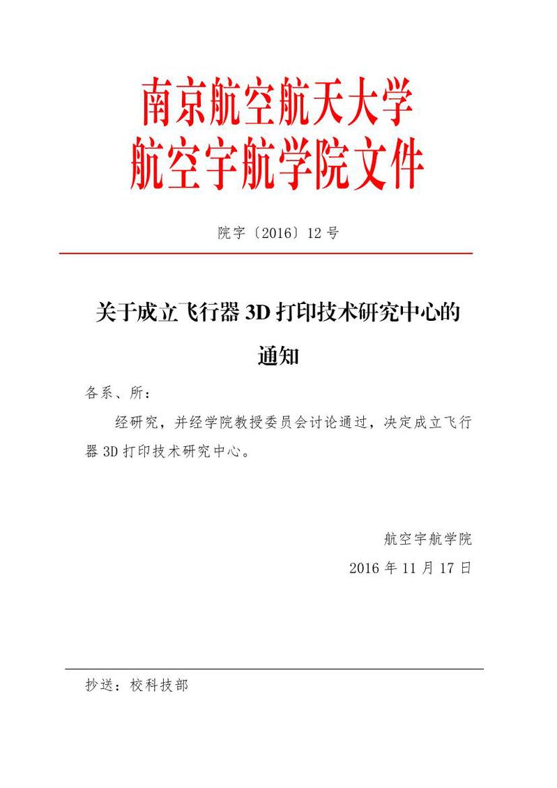 院字[2016]12号关于同意成立飞行器3D打印技术研究中心的通知