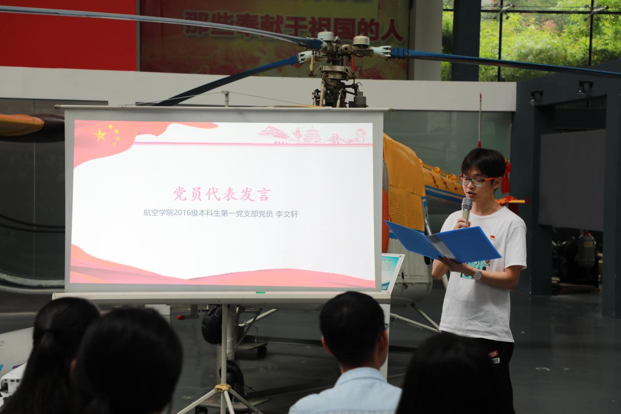 2016级本科生第一党支部党员李文轩作为毕业生党员代表发言。他讲述了自己从一名懵懂的员工成长为一名党员的经历,并代表全体毕业生党员向党组织表态,将以建设社会主义现代化强国为己任,不辜负党的信任、国家重托和人民期望,树立远大理想、热爱伟大祖国、担当时代责任、勇于砥砺奋斗、练就过硬本领、锤炼品德修为,为实现中华民族伟大复兴的“中国梦”而奋斗。