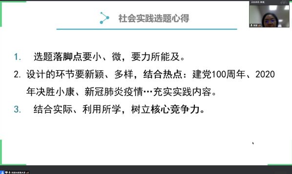 “因为今年疫情的影响,如何让特殊时期的社会实践效果和往期的实地社会实践效果一样好,是我们需要关注的问题。”“我比较关注本次社会实践的丰富性这个问题。”——这是韩楚随机提问的两位同学对于本次社会实践的期待。