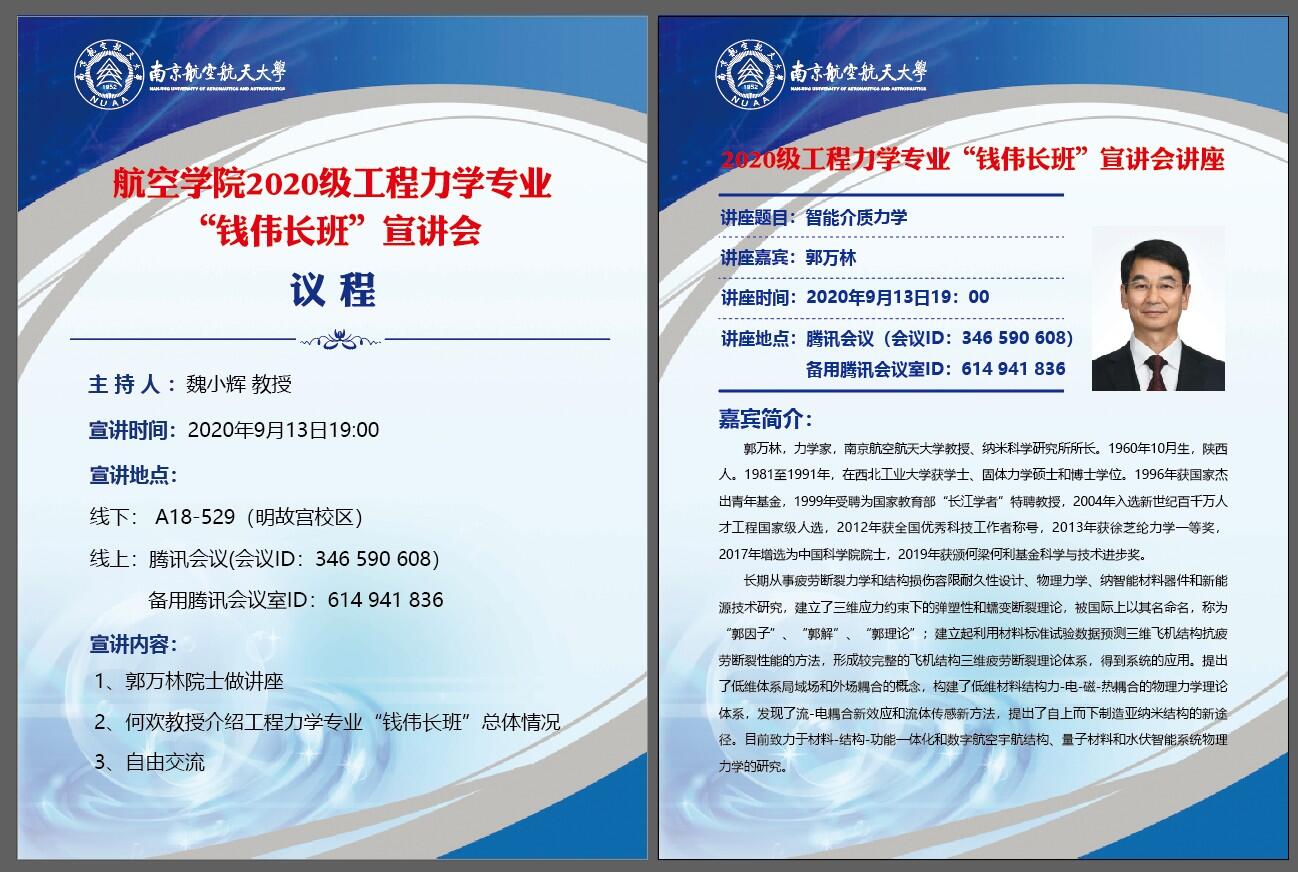 bevictor伟德2020级工程力学专业“钱伟长班”选拔宣讲会于9月13日晚在明故宫校区A18-529教室和腾讯会议平台,线下线上同步进行宣讲。本次宣讲会由bevictor伟德副经理魏小辉教授主持,纳米科学研究所所长郭万林院士、经理助理陆洋教授、振动工程研究所所长何欢教授出席了本次会议。