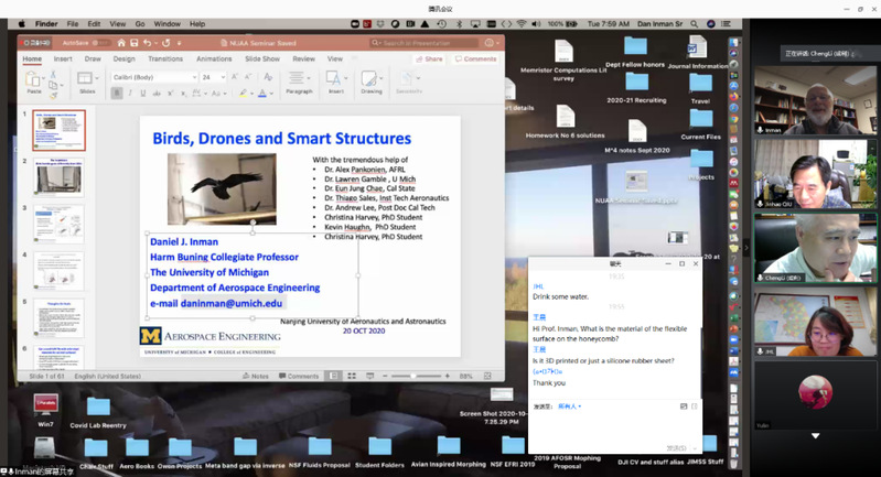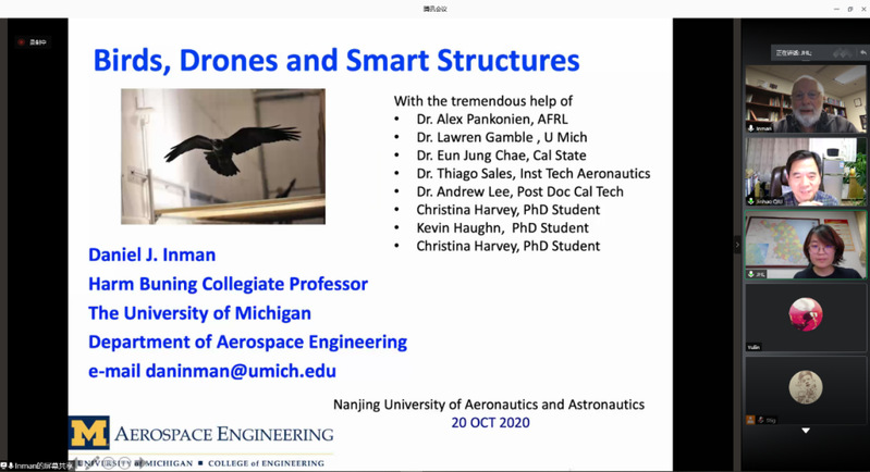 应公司bevictor伟德机械结构力学及控制国家重点实验室裘进浩教授的邀请,密歇根大学航空工程公司Daniel J. Inman教授于2020年10月20日做了题为“Birds, Drones and Smart Structures”的学术报告。报告介绍了变体飞行器的研究来源,重要意义和关键问题。探讨了智能材料,如压电复合材料MFC在变体机翼中的应用技术,并分享了课题组在该领域的最新进展。报告从介绍滑翔时鸟的翅膀和尾巴所表现出的有趣现象展开,生动地引入对变体飞行器结构的研究,在介绍变体结构技术的同时,以课题组具体的实验研究和视频资料展示了变体机翼的动作过程。此外,Inman教授还和与会人员积极的讨论相关技术问题。报告内容丰富、精彩生动,对公司相关科研工作具有借鉴作用。