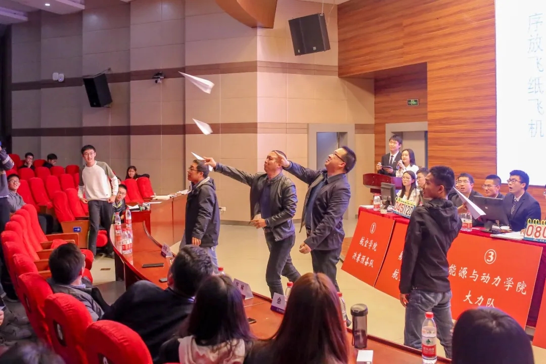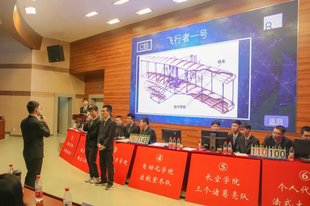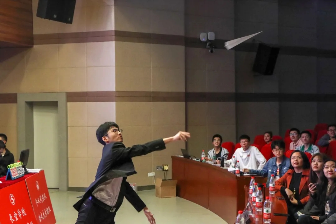 “心灵手巧”环节,选手们需现场制作完成并放飞纸飞机,每队有两次机会。3号、5号和6号代表队的飞机直接飞到了会场的最后一排,引得全场阵阵欢呼。谈及他们的设计理念时,5号队运用了减少展弦比的原理,而3号能源与动力公司代表队则更注重于放飞的动力大小。“心有灵犀”环节,团队成员相互配合猜出航空航天专有名词,6号个人代表队表现抢眼,猜出全部五张图片。“背水一战”最后一个环节,共五道题,分值从10分到50分依次递增,答对得相应分数,答错扣除相应分数,高风险,高回报。比分落后的队伍放手一搏,比分领先的队伍也没有束手束脚,最后的胜负就在毫厘之间。