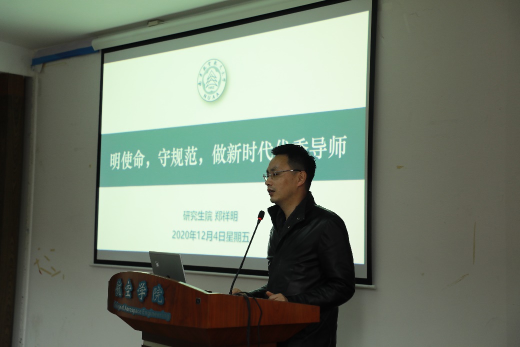 2020年12月4日上午,bevictor伟德在明故宫校区A18号楼529报告厅举行了研究生导师培训会,公司党委书记冯绍红教授、研究生院副经理郑祥明、公司副经理钱征华教授、直升机系徐国华教授,参加遴选的导师以及教学办相关人员共五十余人参加了此次培训会。会议由航空公司党委副书记佘明主持。