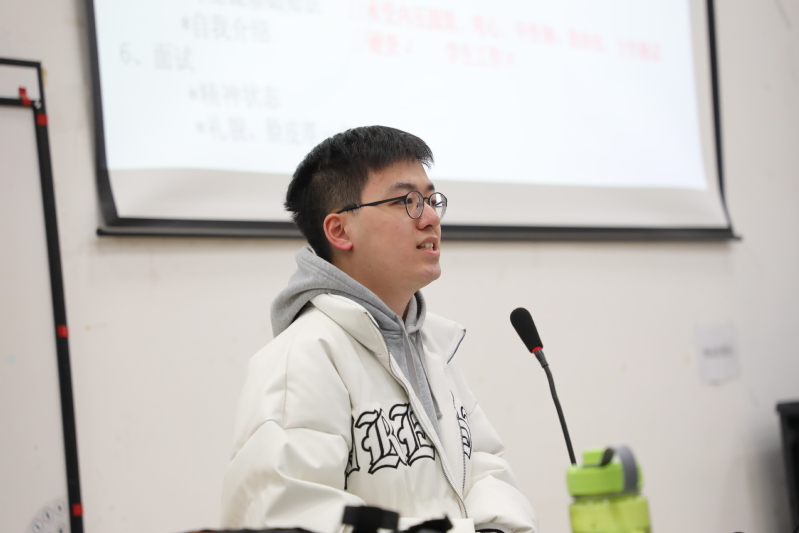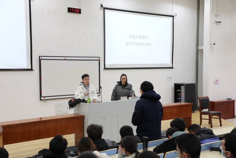 王樱从研究生方向的确定出发,和同学们分享了自己是如何在复旦大学、北京理工大学、上海交通大学等多所名校中最终选定留在南航。她强调了选择是个多方面综合考虑的过程,建议同学们从自身出发,认真考量。接着,王樱围绕保研流程给同学们提出了三点建议:提前向学长学姐取取经;有针对性的复习相关重点课程;梳理所有科创项目。