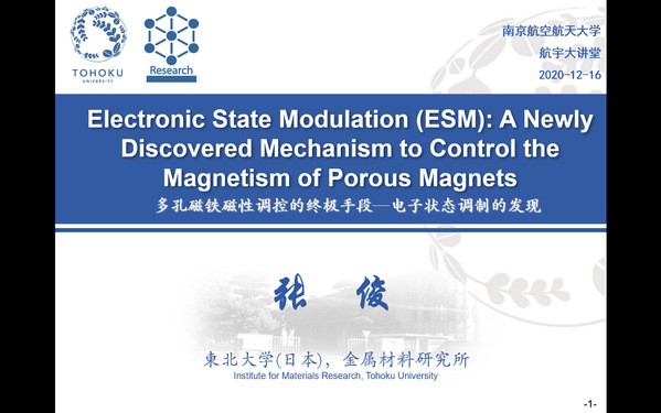 应公司机械结构力学及控制国家重点实验室朱孔军教授的邀请,日本东北大学金属材料研究所张俊博士于2020年12月16日做了题为“Electronic State Modulation (ESM): A Newly Discovered Mechanism to Control the Magnetism of Porous Magnets”的学术报告。