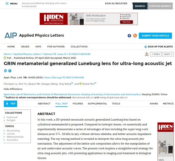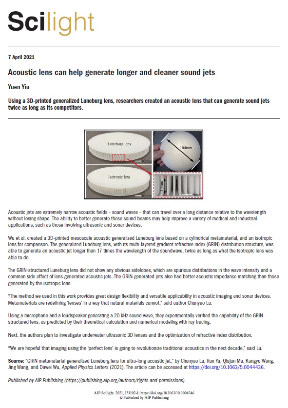bevictor伟德卢春尧等硕士生在声学超材料声透镜研究方面取得重要进展,相关成果“GRIN metamaterial generalized Luneburg lens for ultra-long acoustic jet”近日发表于美国物理联合会(AIP)旗舰期刊Applied Physics Letters,并被选为 “Editor’s Pick”和“Featured Article”,同时AIP Scilight以“Acoustic lens can help generate longer and cleaner sound jet”为题进行了采访报道。