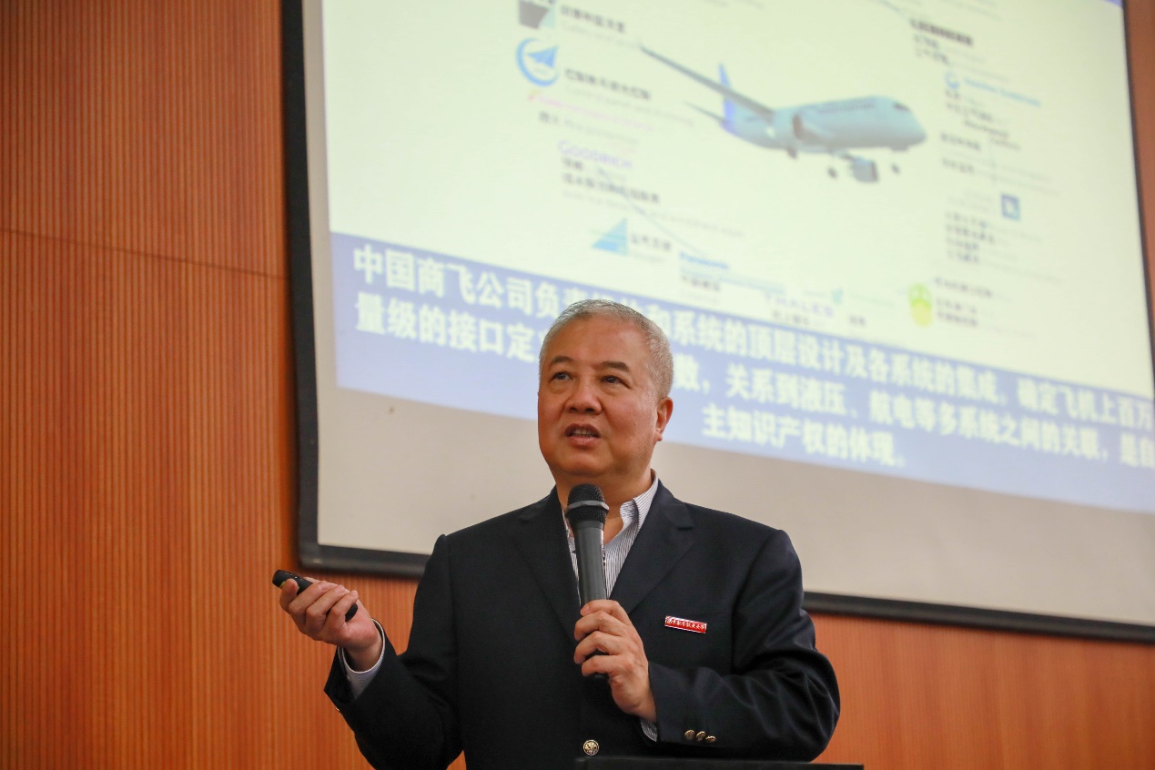 在讲述“中国商用飞机发展历史”这一部分时,吴光辉通过生动的影像资料和风趣幽默的语言回顾了C919大型客机的制造、部装、总装、试验、试飞的全过程。“我们不仅是以中国商飞的水平、中国的水平来定义C919,还是以世界的水平研制C919。”他自豪地说,“大飞机产业,就是要举全国之力,聚全球之智,基本建成‘以中国商飞公司为核心,联合航空工业,辐射全国,面向全球’的中国民机产业体系。”吴光辉向同学们介绍了C919大型客机先进的驾驶舱理念设计、中国第一次自主设计便达到世界先进水平的超临界机翼、完全自主设计及国内制造的机体结构等,传授了飞行器设计方面的相关知识的同时,也激发了同学们学习专业知识的热情。