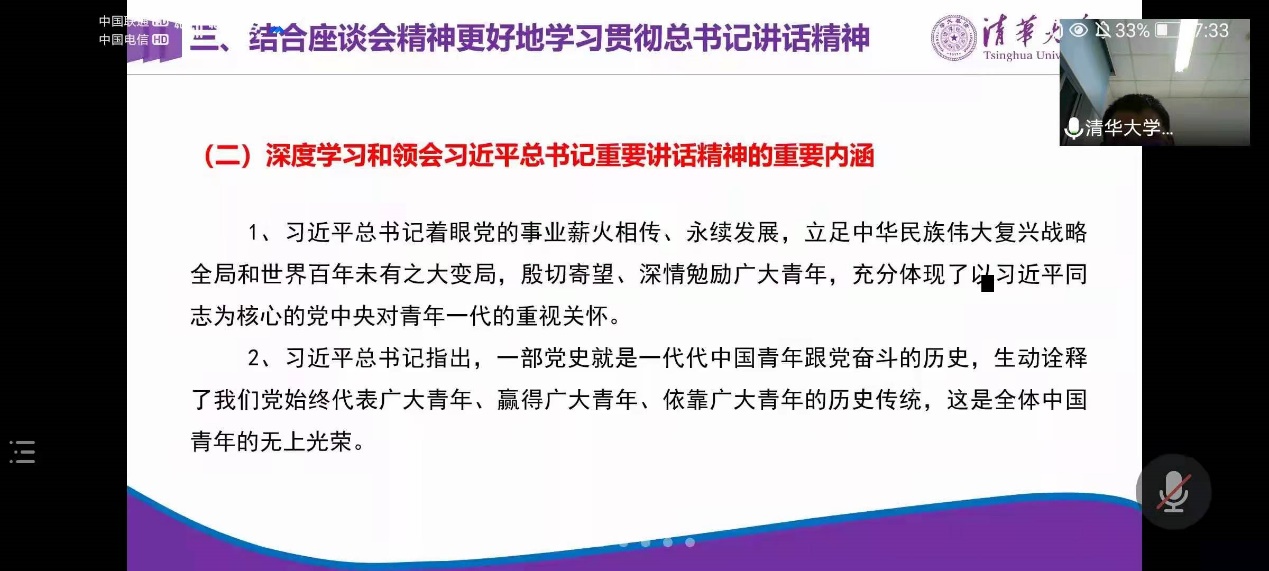 2021年4月19日,在清华大学建校110周年以及五四青年节即将来临之际,习近平总书记来到清华大学考察并发表重要讲话。深入学习贯彻习近平总书记重要讲话精神,对于切实落实立德树人根本任务,与时俱进建设中国特色世界一流大学和高质量教育体系,着力培养德智体美劳全面发展的社会主义建设者和接班人,具有十分重要的意义。为教育引导广大青年团员心系“国之大者”,胸怀“两个大局”,坚定“听党话、跟党走”,结合公司党史学习教育工作要求,bevictor伟德智能所2019级硕士团支部联合本科0120301团支部,邀请清华大学马克思主义公司“百年百讲”党史学习教育专题宣讲团开展了线上宣讲活动。