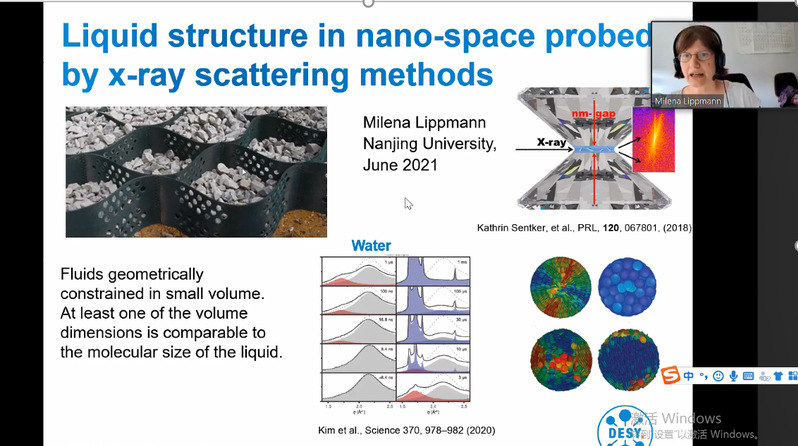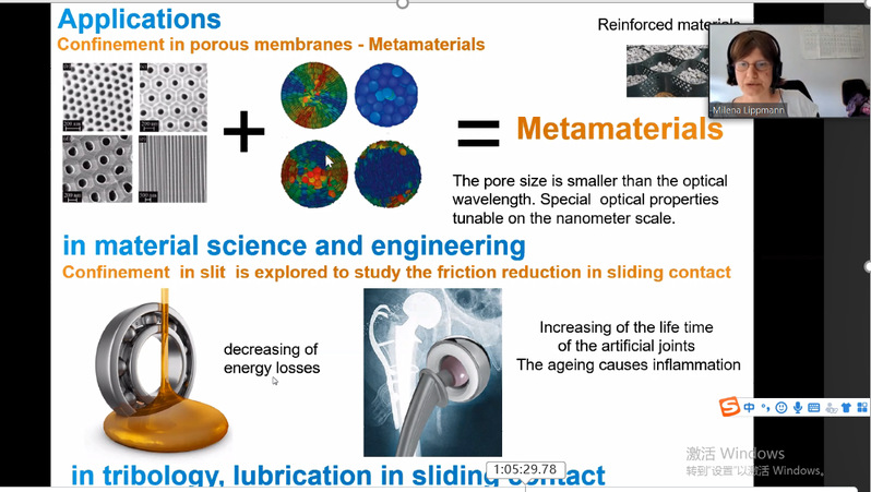 应力学中心王单讲师的邀请,德国Deutsches Elektronen-Synchrotron (DESY )研究所化学实验室负责人Milena Lipmmann教授于2021年6月10日做了题为“Liquid structure in nano-space probed by x-ray scattering methods”的学术报告。报告介绍了如何用X射线研究纳米级受限空间中的液体分布形态,分子结构等,以及在超材料、拓扑摩擦学、生物医疗等领域中的应用。Milena从实验的角度介绍了液体在受限空间中的相分布,表面效应及动力学特性,以及目前搭建的可压缩至纳米尺度受限空间实验装置的相关研究成果。她介绍了以钻石为基底,将水、四氯化碳、TMS等液体压缩至纳米尺度的空间中,用X射线散射观察到了明显的分子分层排列现象,以及接近表面的液体分子呈现取向性排列。此外,Milena还和与会人员讨论了相关学术问题,精彩的报告也为公司相关科学工作提供了借鉴作用。