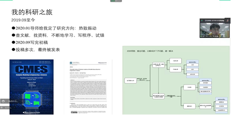 流体力学专业2018级博士生王镇明分享了研究生科研路上一定要学会两件事:坚持看文献,坚持做记录。他以自己举例,从外校到南航数学专业,再到现在的计算流体力学专业,专业变化很大,但是他一直积累,一直学习,所以才取得了今天的成果。