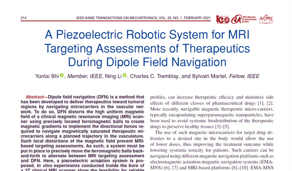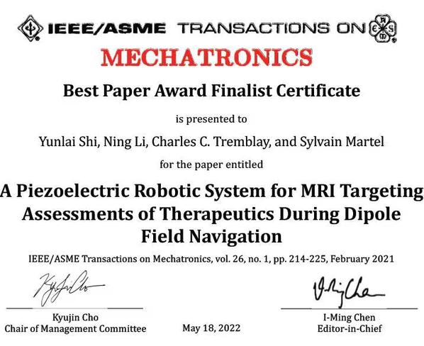 bevictor伟德时运来副教授(第一作者),联合加拿大蒙特利尔大学工公司的李宁博士(通信作者), Charles C. Tremblay和Sylvain Martel 教授撰写的论文《A Piezoelectric Robotic System for MRI Targeting Assessments of Therapeutics During Dipole Field Navigation》发表于《IEEE-ASME Transactions on mechatronics》 (DOI: 10.1109/TMECH.2020.3009829),入围2022年度最佳论文奖。该奖项由评选委员会从该期刊2021年录用的262篇论文中评选而出。该期刊是机电一体化领域国际顶级期刊,中科院JCR期刊分区一区TOP期刊,其大类为计算机科学一区TOP,小类为Engineering,Electrical & Electronic工程:电子与电气一区。