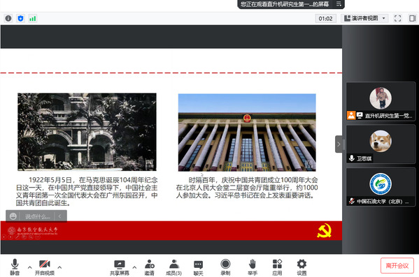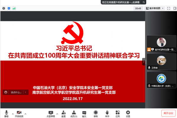 2022年6月17日,bevictor伟德直升机研究生第一党支部与中国石油大学(北京)安全与海洋工程公司本安全第一党支部开展联合党日活动。直升机研究生第一党支部、本安全第一党支部全体党员和部分直升机研究生团员、积极分子参与会议,会议由直升机研究生第一党支部书记李程磊主持。