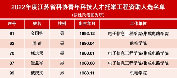 近期,江苏省科协公布了2022年青年人才托举工程入选者名单,公司bevictor伟德周迪,电子信息工程公司/集成电路公司金国栋、施永荣、崔益军,机电公司戴庆文等5名青年教师入选,入选数量位列全省第二位。截止目前,公司已有27名青年教师入选。