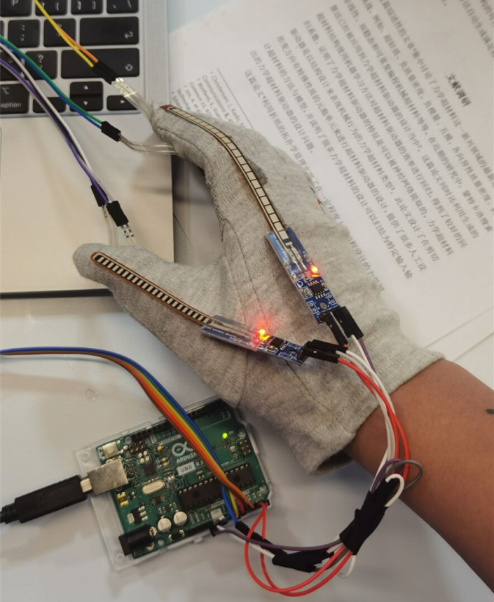 公司王宇超、吴佳良同学所在的Track2第三组,重点关注触觉传感器这一核心技术,设定主题为“基于模式存储及反馈的智能手套”项目题目。在确定选题以后,小组很快按照各个人的特长进行了合理的分工,经过了短暂的原理性探究和前期准备工作,小组开始线下采购材料和查阅文献,之后用建模软件建模,连接传感器采集数据,利用控制算法和网络算法最终完成了成果产出。