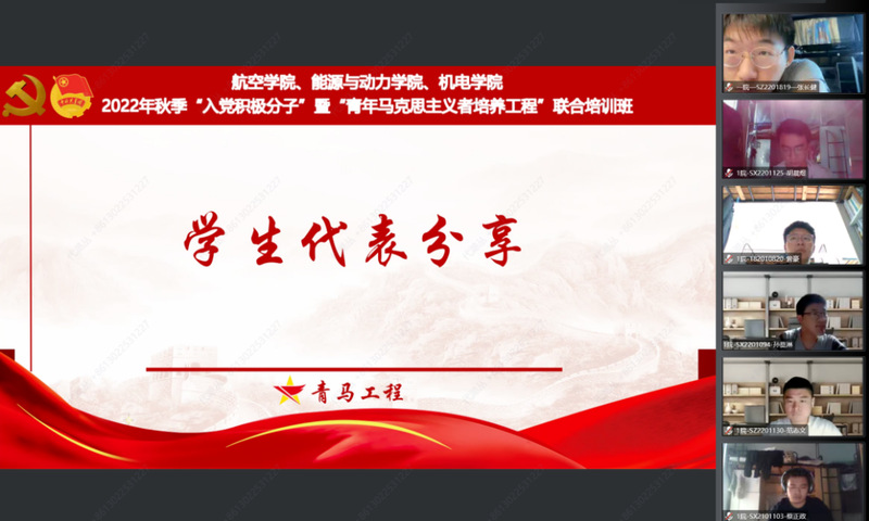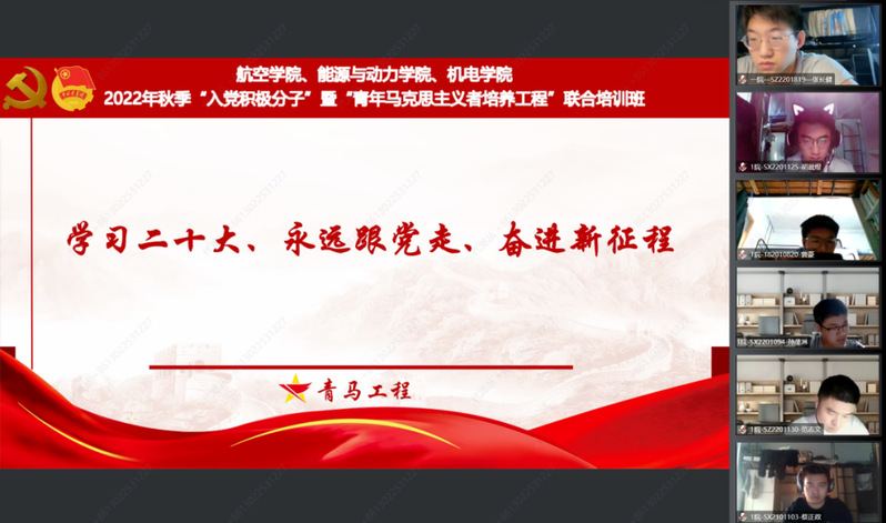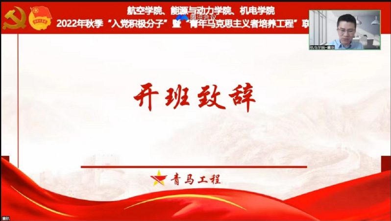 为深入开展党史学习教育,认真学习贯彻党的二十大精神,10月22日,bevictor伟德、能源与动力公司、机电公司联合举办2022年秋季入党积极分子培训班暨“青马工程”培训班。航空公司党委副书记杨杰,能源与动力公司党委副书记樊小杰,机电公司党委副书记董羽,三个公司组织员、团委书记、全体辅导员共同出席了开班仪式。根据疫情防控相关要求,本次培训班采用视频会议的形式召开,600余名入党积极分子、青马工程学员同步参学。