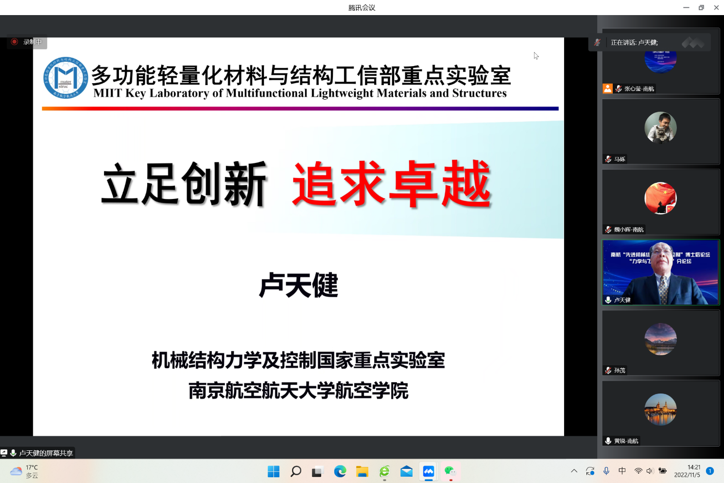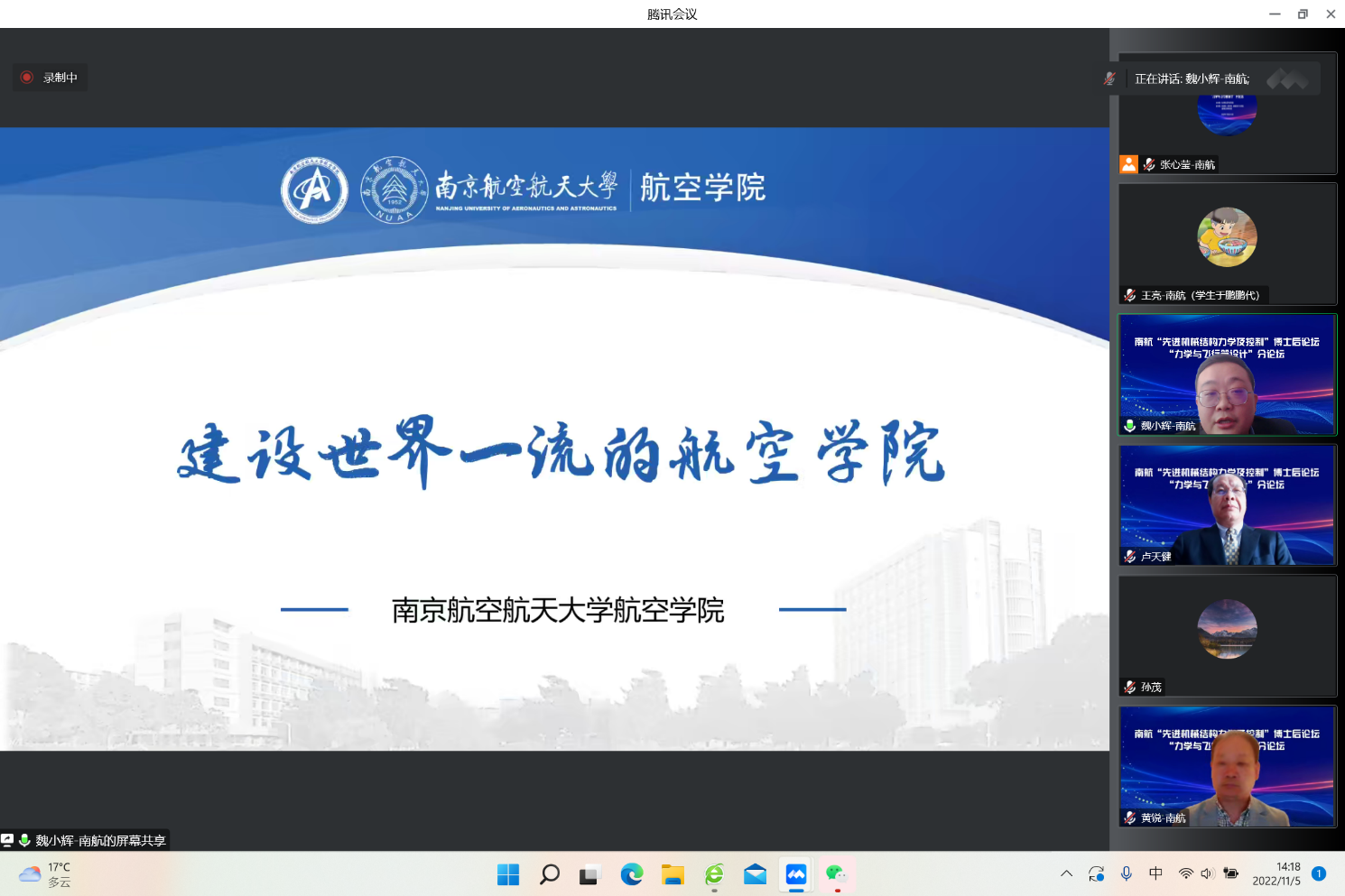 本次论坛由bevictor伟德主办,民航公司、数学公司、通用航空与飞行公司、国际前沿科学研究院协办,主要研究方向有新一代飞行器设计理论与技术、飞行器结构力学与控制、民用飞机适航、健康监测与主动安全技术、流体动力学、通用航空与飞行安全5个方向。本次分论坛采取线上的方式。汇聚了bevictor伟德经理魏小辉、经理助理黄锐,以及来自北京航空航天大学、上海交通大学、西安建筑科技大学以及南航的相关领域专家、优秀青年学者、博士后合作导师、博士后、优秀博士生及博士后工作管理人员共同参会。特邀南航卢天健教授、北航孙茂教授做专家学者报告,活动由黄锐教授主持。