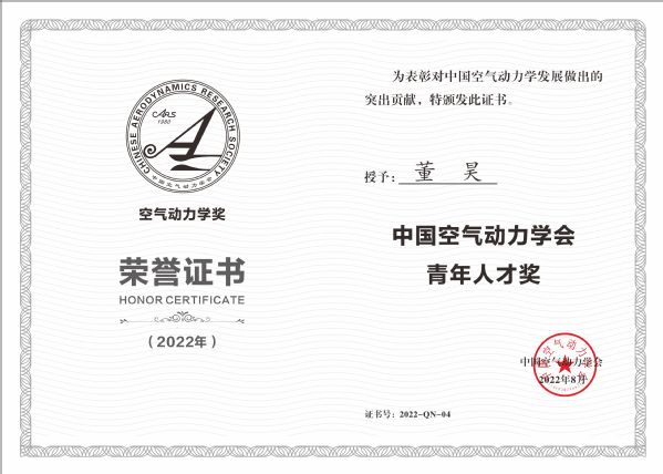 2022年8月,根据《中国空气动力学会空气动力学奖章程》,中国空气动力学会的第二届中国空气动力学奖评审工作已经完成。经评审授予中国空气动力学会青年人才奖5项。公司董昊教授荣获第二届中国空气动力学会青年人才奖。