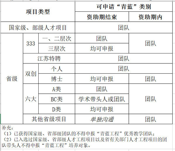 4. 已入选过国家级、部级人才工程项目、“江苏特聘教授计划”、“高层次创新创业人才引进计划”双创个人、“333高层次人才培养工程”第一、二层次和“六大人才高峰计划”A类个人等同层次省级人才项目人员,不得申报优秀青年骨干教师和中青年学术带头人,只可申报优秀教学团队。入选过“六大人才高峰计划”BC类个人等同层次人才项目人员,不得申报优秀青年骨干教师,只可申报中青年学术带头人或优秀教学团队。