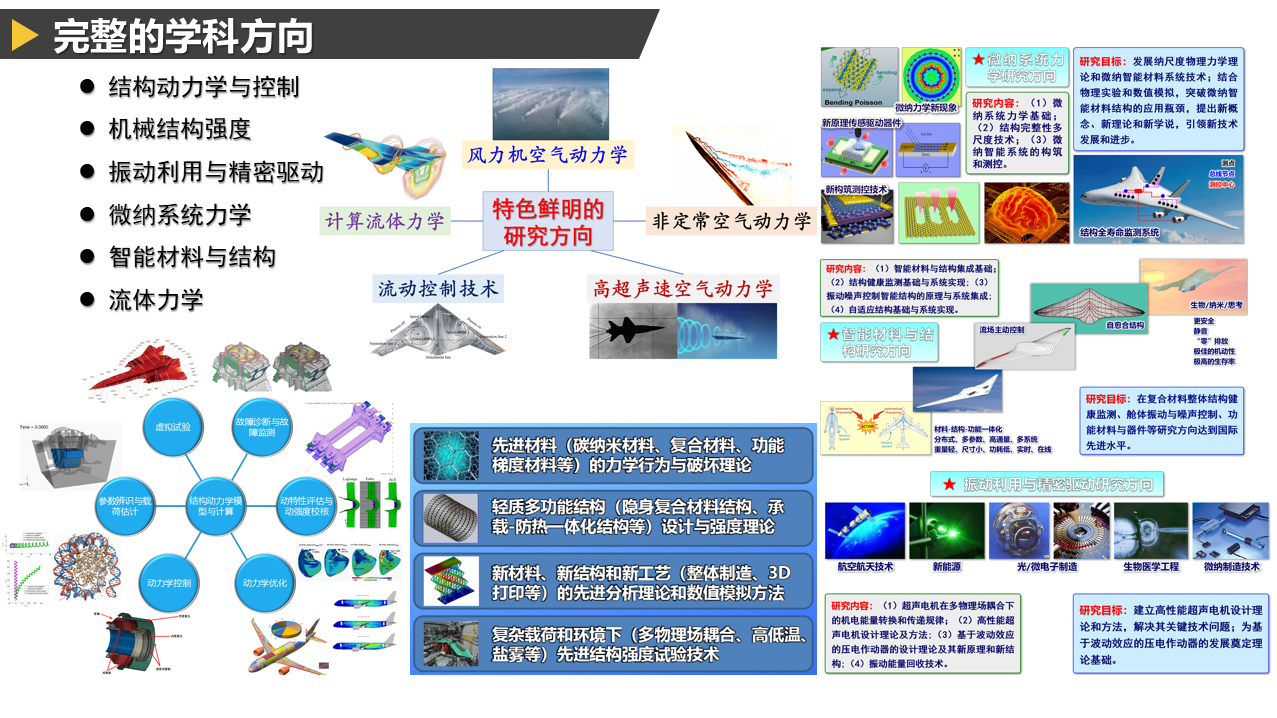 本专业面向航空、航天、国防科技、高新技术等领域涉及的重大力学问题,在结构动力学与控制、机械结构强度、振动利用与精密驱动、微纳系统力学、智能材料与结构等研究方向具有重要地位和广泛的学术影响。遵循“宽口径、厚基础、强能力、高素质”的培养模式,通过力学、数学、机械、信息、控制等多学科交叉融合,培养的员工能在航空、航天、先进制造、交通运输、海洋产业等高新技术领域,以及高等院校、政府企业事业机构等从事技术研发、科学研究、高级管理、技术咨询等专业工作。