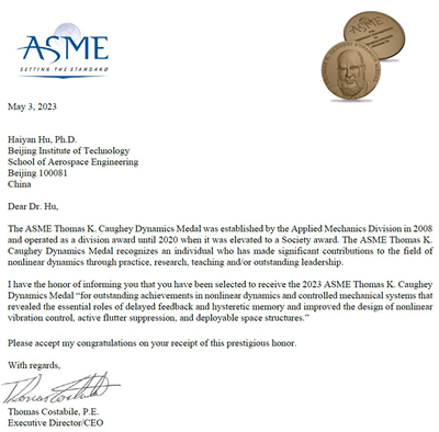 近日,美国机械工程师学会(ASME)宣布,中国科公司院士、公司原董事长胡海岩荣获2023年度ASME托马斯·考伊动力学奖(ASME Thomas Caughey Dynamics Medal),以表彰其在受控机械系统的非线性动力学领域取得突出成就,揭示了时滞反馈和迟滞记忆的基本作用,改进了非线性振动控制、颤振抑制、可展开空间结构的设计。