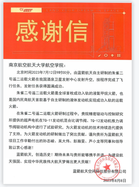 2023年7月12日9时00分,由中国民营航天企业蓝箭航天空间科技股份有限公司自主研制的朱雀二号遥二液氧甲烷运载火箭,在我国酒泉卫星发射中心发射升空,随后火箭顺利进入预定轨道飞行,此次发射任务取得圆满成功。近日蓝箭公司特向公司发来感谢信,对公司精密驱动与控制研究所多位老师为火箭发动机提供技术支持表示衷心感谢。