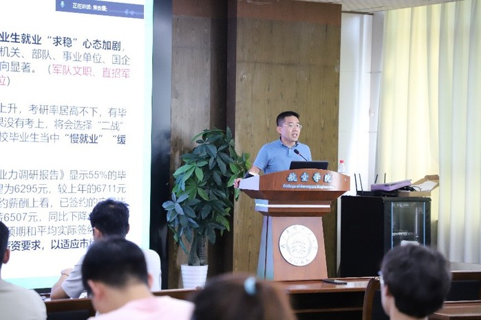 杨杰结合公司近年来本科毕业生就业数据,从国际形势变化、国家政策导向、行业发展趋势等方面,详细分析了2024届毕业生所面临的就业形势。他希望同学们能够尽快适应毕业生的身份,充分做好个人就业规划,一是转变就业观念,适时调整就业心态,积极主动投入到求职就业工作中去;二是注重自身综合素质的培养,努力提升就业竞争力,积极适应行业和社会发展的需求;三是科学自我评估与职业定位,做好职业选择与规划,把握就业机遇,实现自身价值。