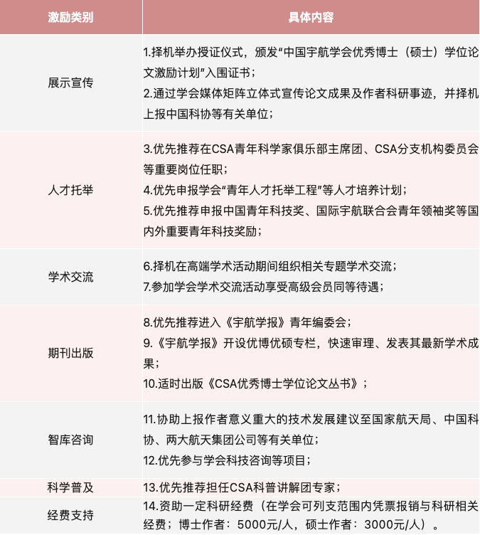 为推动中国宇航领域科技进步,鼓励创新性研究,激励宇航领域的博士、硕士研究生潜心钻研,务实创新,解决宇航领域中重要理论和实际问题,中国宇航学会(CSA)决定从2023年起开展优秀博士、硕士学位论文激励计划(以下简称CSA优博优硕计划),旨在每年评选优秀博士、硕士学位论文各不超过10篇,树立一批做出优秀成果的航天青年,展示一批高水平的青年学术论文,激励更多青年科学家、学者把论文写在祖国的大地上,并为航天事业赓续奋斗,做出更大的贡献。为做好公司组织申报工作,现将有关事项通知如下: