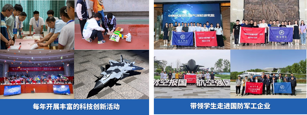 通过举办航空航天知识竞赛、飞行器复原制作大赛、科创训练营等双创活动,打造低年级普惠教育,高年级拔尖领航的实践育人体系通过访企拓岗、国防企业面对面、社会实践等活动,每年带领500余名员工走进国防军工企业,实地感受军工文化,树牢航空强国志。院士、总师授课,与员工共话航空航天蓝图,为员工描绘专业方向。