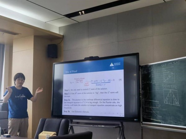 学术报告于20日上午10:00开始,唐智礼教授首先向大家介绍了Cheskidov教授和徐霄乾教授,并对二位教授的到来表示热烈欢迎。讲座过程中,Cheskidov教授从N-S方程出发分析了在湍流中,强制低模式(大尺度)注入的能量会在惯性范围内逐级扩散到小尺度,而在惯性范围内,粘性效应可以忽略不计,只有在科尔莫哥罗夫耗散波数以上才会耗散。能量通量在惯性范围内的持续存在是粘性流体流的耗散异常和极限无粘性流体流的异常耗散的原因。证明了在粘度消失的极限流中存在的各种情况,从总耗散异常到发生异常耗散而无耗散异常的病态情况,以及在粘度消失的极限中存在无穷多个欧拉方程的极限解。最后,通过扩展所获得的总耗散异常构造,证明了与湍流相关的长时间平均耗散异常的存在,证明了 Doering-Foias 上限是尖锐的。