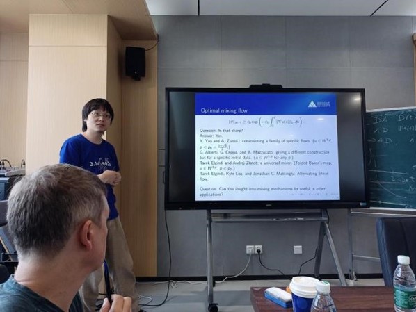 徐霄乾教授由生活中的实例引入混合流的概念,讲解其在平流-扩散反应方程领域中所起的作用,例如著名的趋化性Keller-Segel方程,随后徐霄乾教授着重讲解了对流项在混合流方程中对于混合效果的重要性,并详细介绍了蜂窝流和剪切流在流体混合过程中的良好效果及其数学解释。讲座过程中两位教授与我方师生就讲座内容进行了充分的交流,开阔了老师和同学们的眼界,对大家从事研究工作有很大启发。