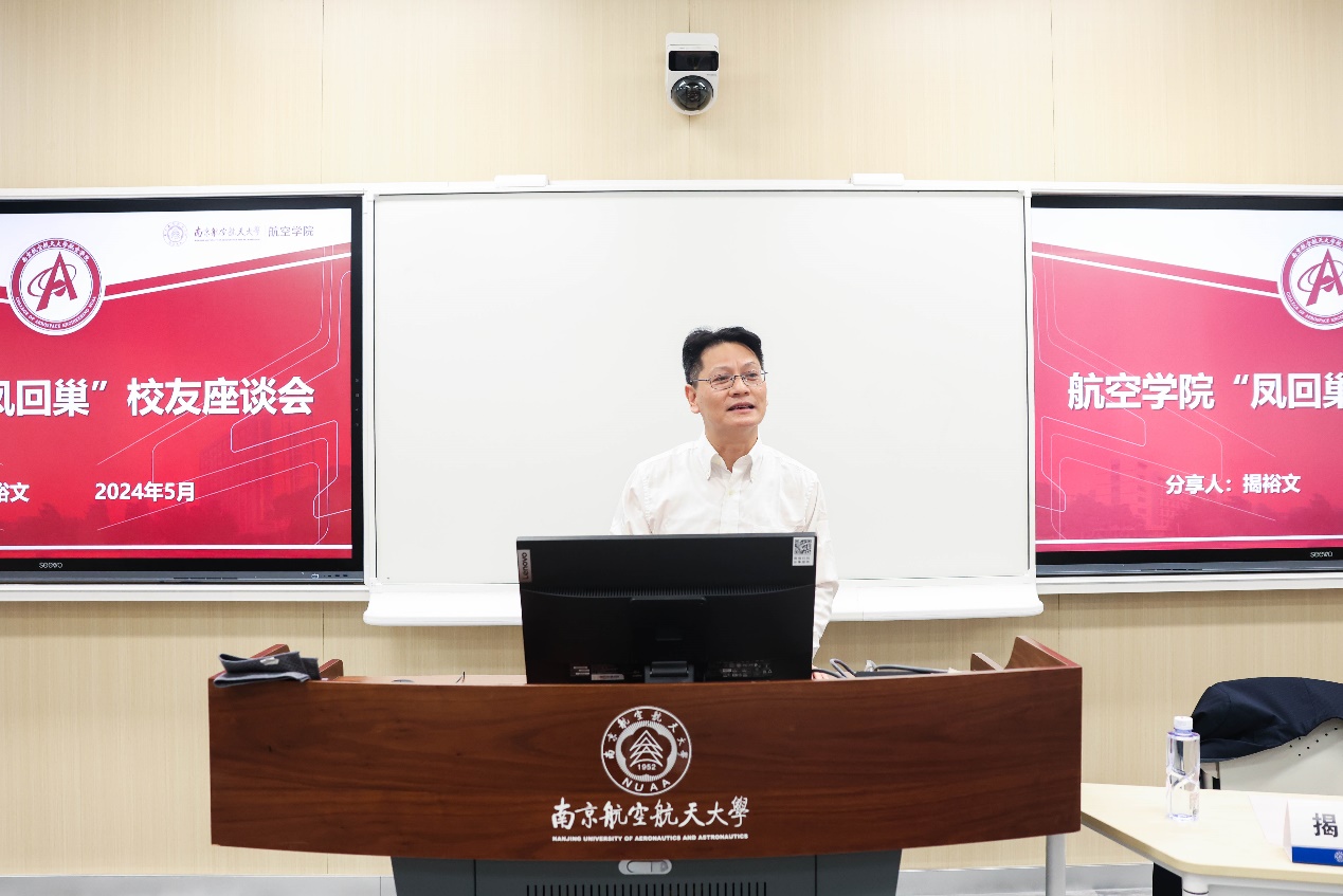 会上,揭裕文院友分享了在南航的求学经历,并对在校老员工的专业学习和人生规划给予宝贵建议。他表示,从高中到大学要迅速转变学习方式,努力提高自身的自学能力,为未来工作奠定了坚实基础。他鼓励大家要保持专注,持续学习,按照100000小时定律去深耕与磨练,才有可能成为某个领域的专家。
